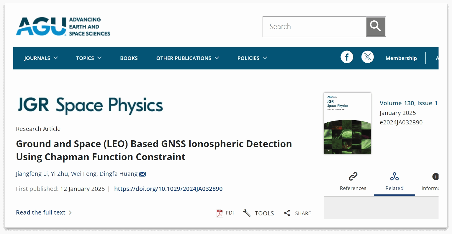 近日,团队研究成果 “Ground and Space (LEO) based GNSS Ionospheric Detection using Chapman Function ” 在 美国地球物理学会的期刊J GR Space Physics ( 空间物理 )上发表(第一作者李剑锋博士,通信作者为黄丁发教授)。该期刊定期发表与ASTRONOMY & ASTROPHYSICS研究领域相关的原创研究论文、评论以及行业研究的高水平学术成果、最新科学理论。该文章提出了联合地基CORS与低轨卫星(LEO)观测平台,研究星地融合电离层探测技术,克服了全球电离层模型在极区、海洋等区域精度低、不可靠等问题,并提高了电离层模型对地磁扰动的适应能力。
