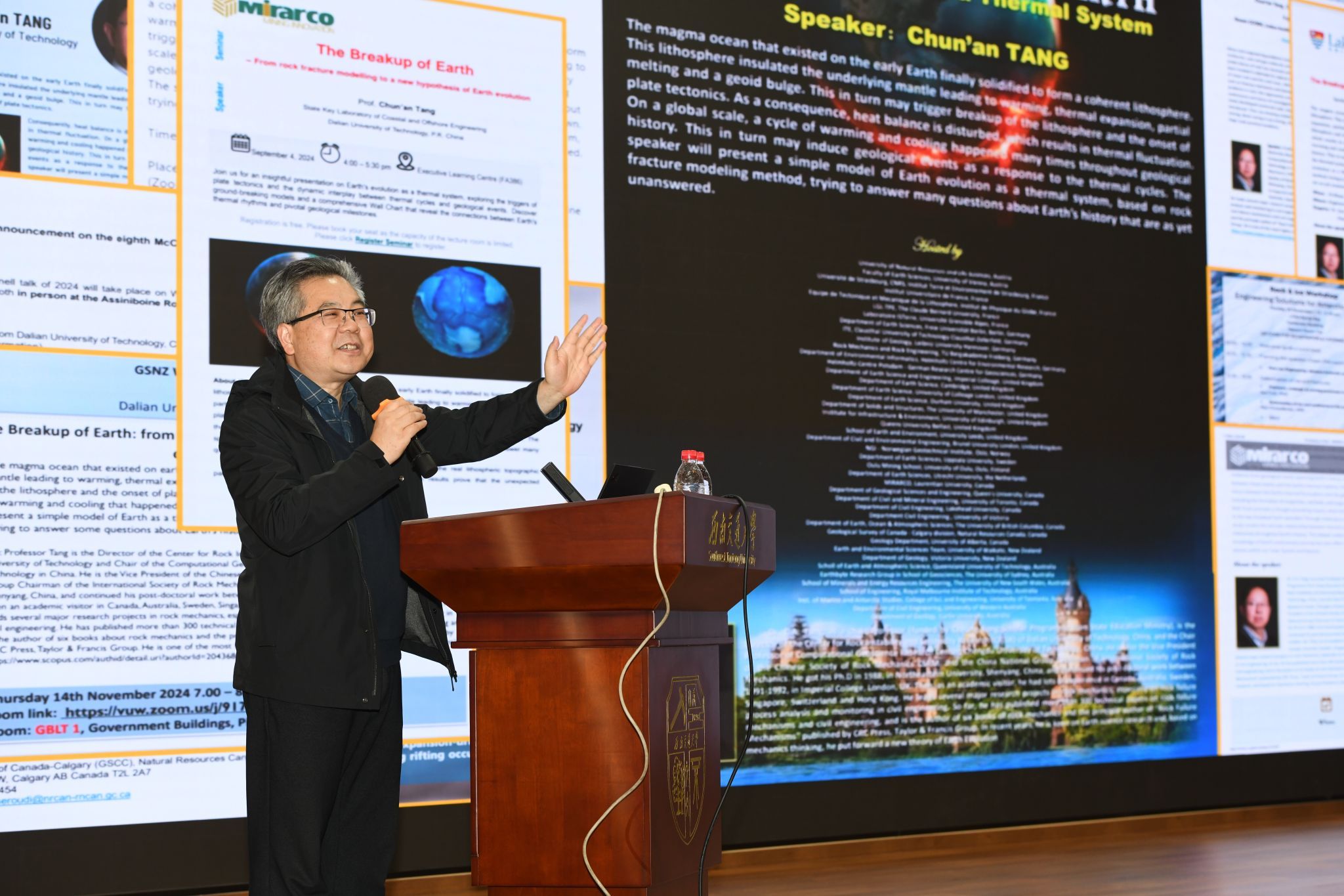 西南交通大学首席教授、中国工程院何川院士致欢迎辞。何川院士对唐春安教授的到来表示热烈欢迎和诚挚的感谢,并高度评价了唐教授在土木及地质工程与地球科学交叉领域的开创性研究。唐春安教授曾三次来访西南交通大学,带来地球大龟裂学说的重要进展。他表示,唐教授的研究不仅具有重要的理论意义,还为防灾减灾、资源开发等实际工程问题提供了科学依据。