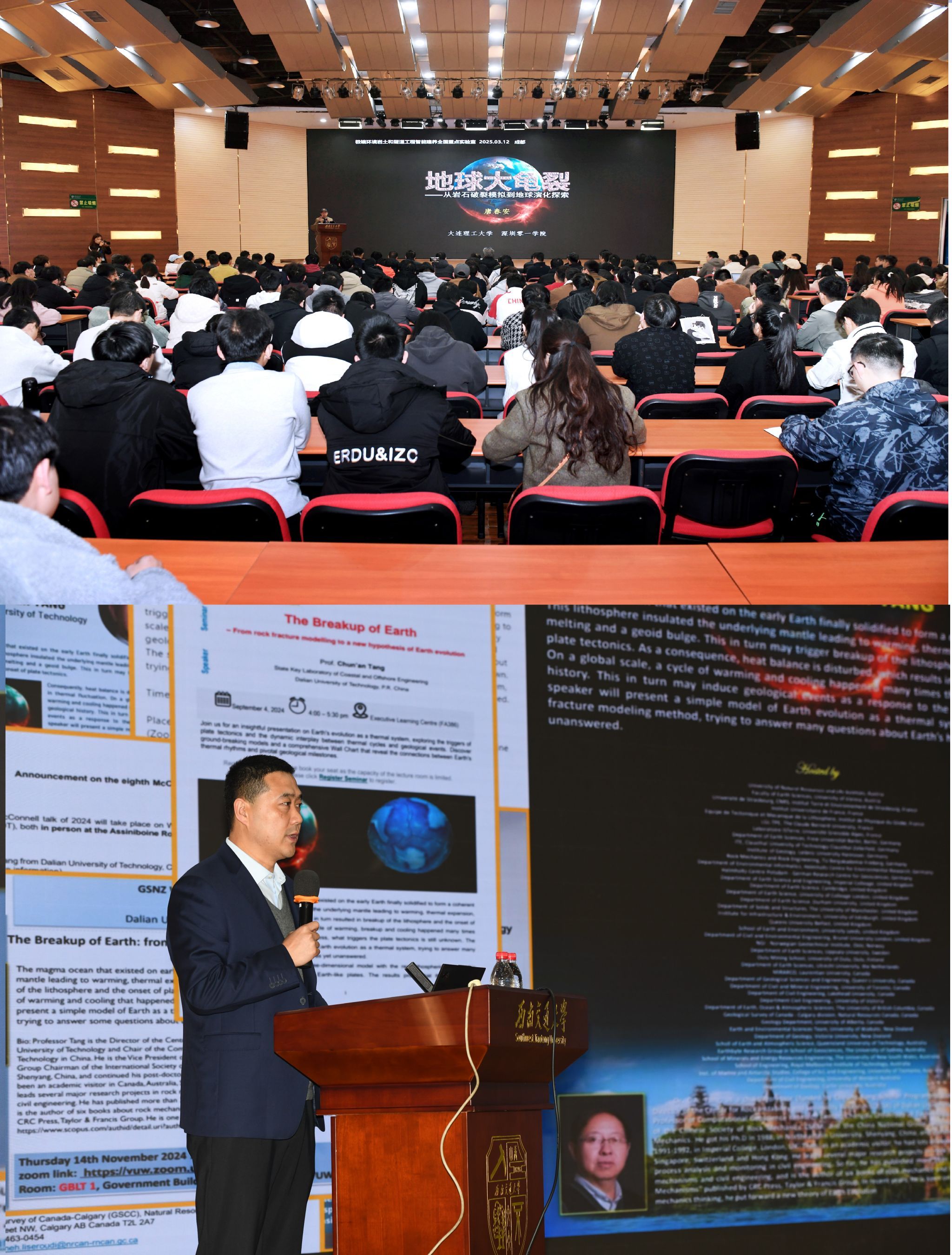 讲座中,唐春安教授基于热力学、物理学和力学的基本原理,从龟裂的形成机理入手,详细阐述了“地球大龟裂”理论。唐教授提到,该学说通过自主研发的地球模拟器2.0,模拟了岩石圈的破裂过程,揭示了板块起源的龟裂模式,特别是洋中脊裂谷的形成过程。他还通过建立地球系统的热平衡方程,解释了岩石圈破裂如何诱发地球冷-热波动的演化机制。