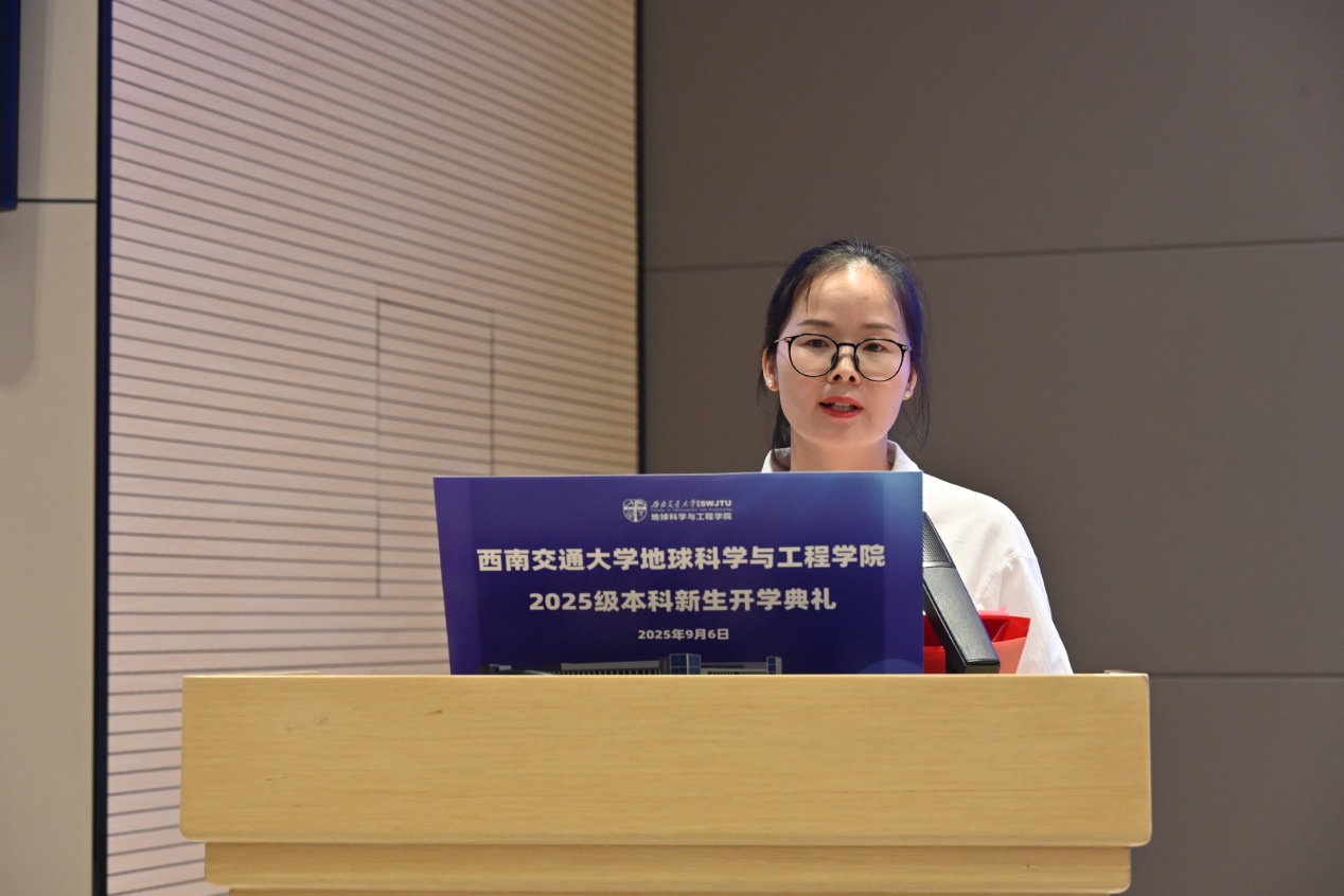 教师代表测绘遥感信息系吴小丹老师发言。她从个人在交大的求学、工作经历出发,分享了五个“地学人”的成长密码,即与不确定性共舞,从混沌中发现规律的能力;培养跨尺度思维,要成为多学科复合型人才;锻造工程良知的职业操守,让每一个数据都经得起历史的检验;保持科学童心,做好奇的探索者;追求德才兼备,成为德业双馨的新时代地学人。最后,她祝愿同学们在未来的学习与实践中,脚踏实地,仰望星空,真正成长为具有家国情怀与专业精神的地学人。