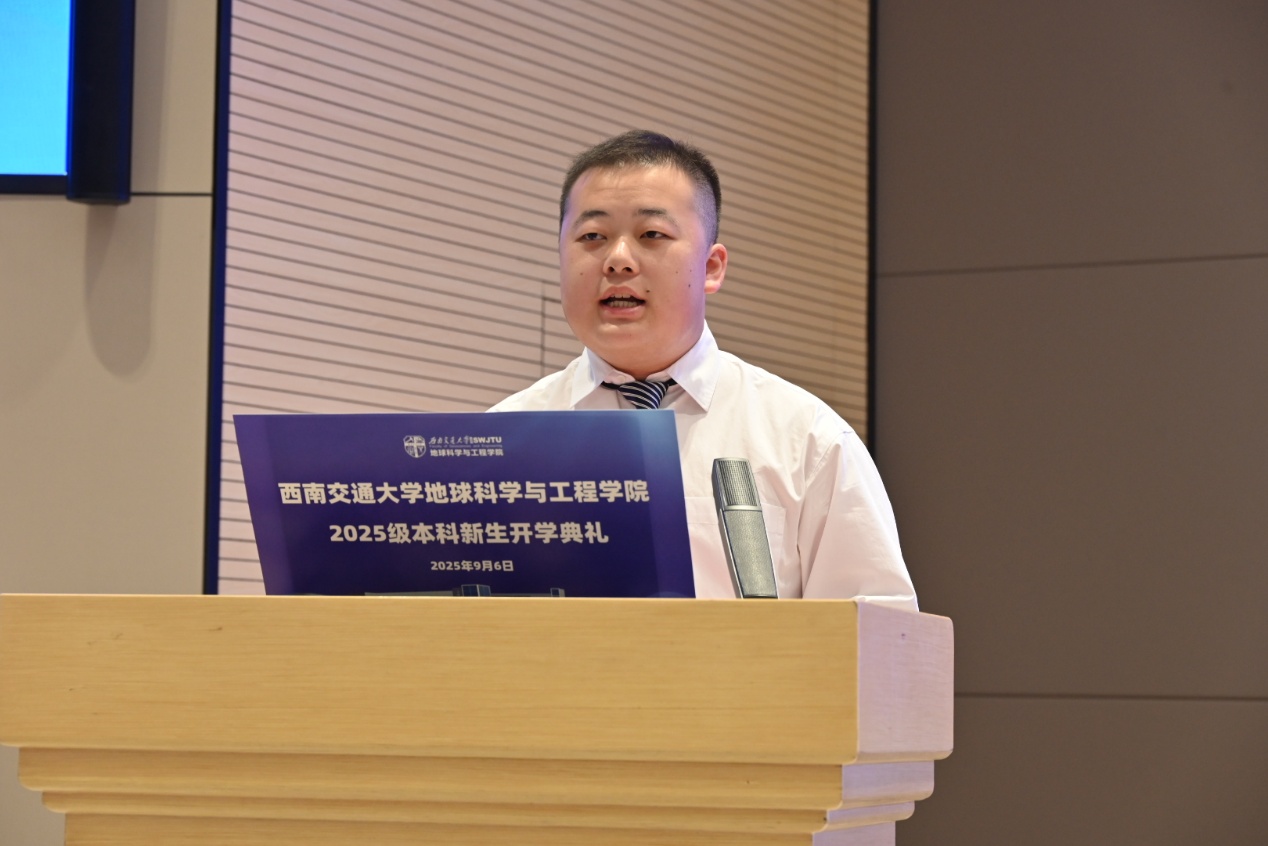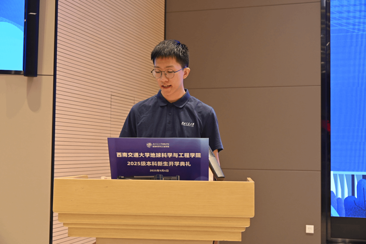 新生代表2025级测绘类专业刘宁同学发言。他回顾了刻苦拼搏的高中岁月与初入交大的新鲜体验,表达了对未来大学生活的憧憬与担当民族复兴大任的决心。他号召全体新生主动求知、勇于开拓,珍惜大学时光,勤勉务实、锤炼品格,以交大为新征程的起点,用奋斗书写无愧于自我、无愧于时代的青春篇章。