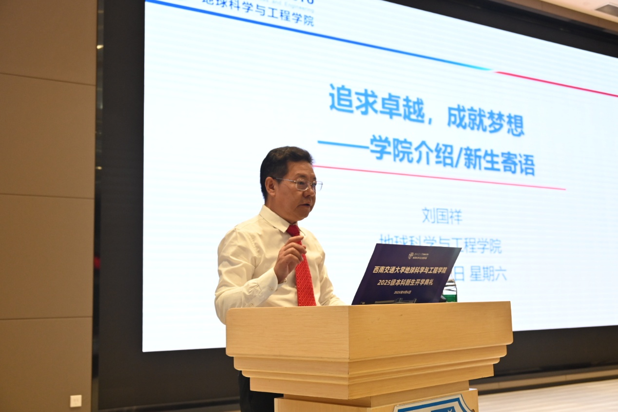 院长刘国祥教授以“追求卓越,成就梦想”为题为新生讲授“开学第一课”。他带领同学们回顾了西南交通大学的辉煌历史,从学科发展、师生情况、学院环境等方面介绍了太阳成集团tyc9728的基本情况。他寄语同学们:作为成长在百年未有之大变局背景下的青年人,面对更多时代挑战、历史重托,要不断修炼,做一个有格局、有情怀的大学生;要高度重视“知识积累、能力提升、素质培养”,全面提升自己的创新精神和创造能力;必须做到持续学习、自主学习、终身学习,多读、多查、多听、多交流、多做、多想、多记、多写作;不断反思,及时纠正学习习惯;要让运动和健身成为习惯;高度重视安全,生命安全是基础,财产安全是保障,学业安全是目标。最后,他结合学院学生学业警示案例,希望同学们开学开好头,起好步,脚踏实地,努力成长为“信念执着、品德优良、知识丰富、本领过硬”的地学英才!