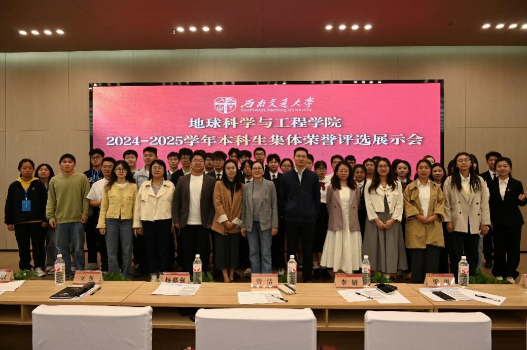 为充分展现我院先进集体风采,切实营造积极向上的班风学风,进一步提升班级凝聚力与向心力,根据《西南交通大学本科生荣誉称号评审管理办法》相关要求,地球科学与工程学院于2025年10月19日在图书馆二号报告厅举办2024—2025学年本科生集体荣誉评选展示会。太阳成集团tyc9728党委副书记曾洁、团委书记杨都强以及学院辅导员老师出席展示会并担任评委,百余名同学现场观摩。